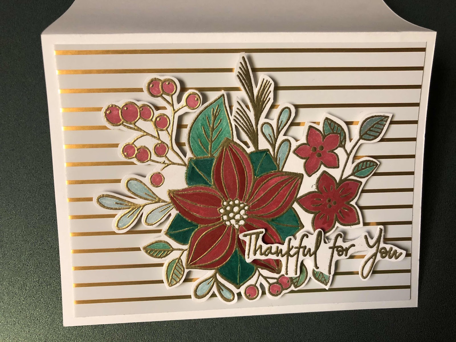 Look at these beautiful Pink Fresh Poinsettia floral clusters. I stamped and gold embossed both the floral and the sentiment. A great floral to watercolour. I used the red and green watercolours to colour it. Of course I had to pop it up with foam tape - because of course “dimension is life”.